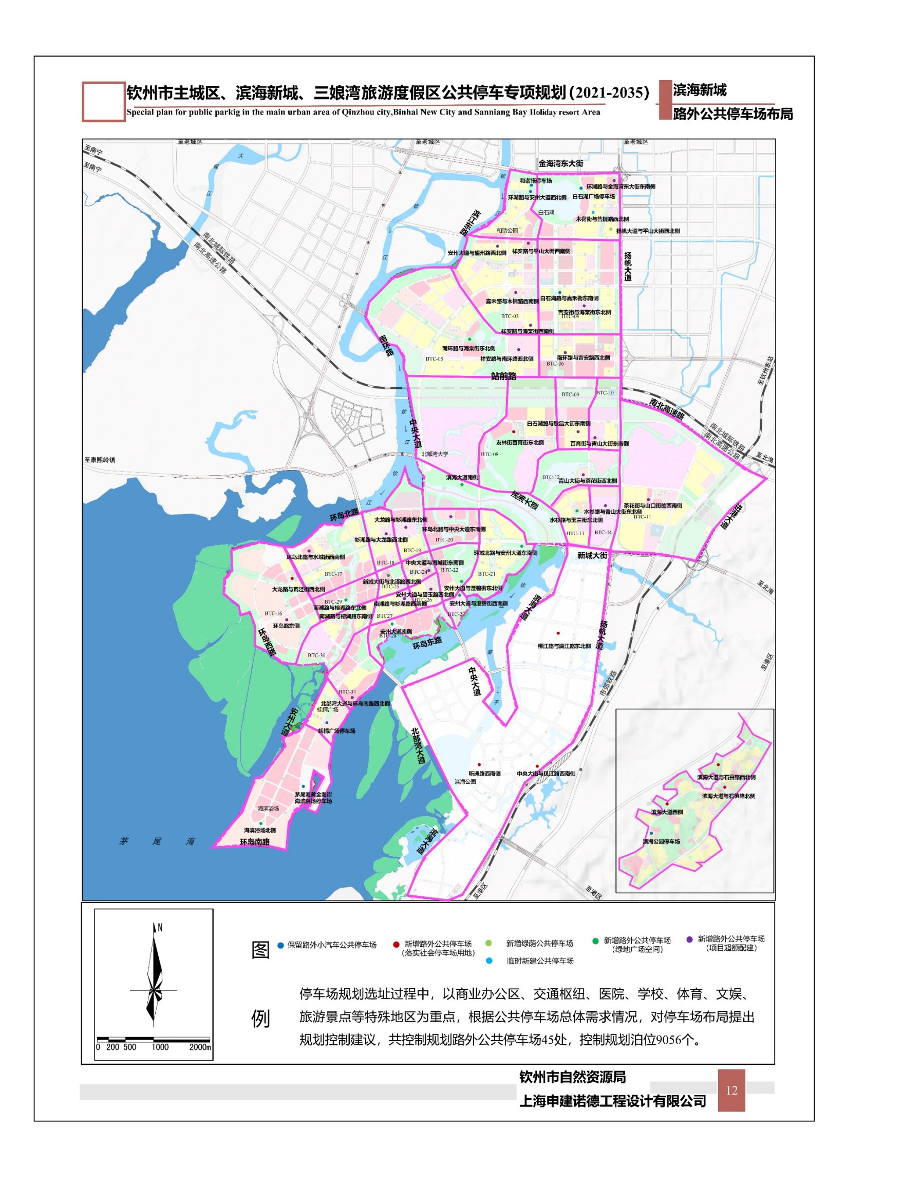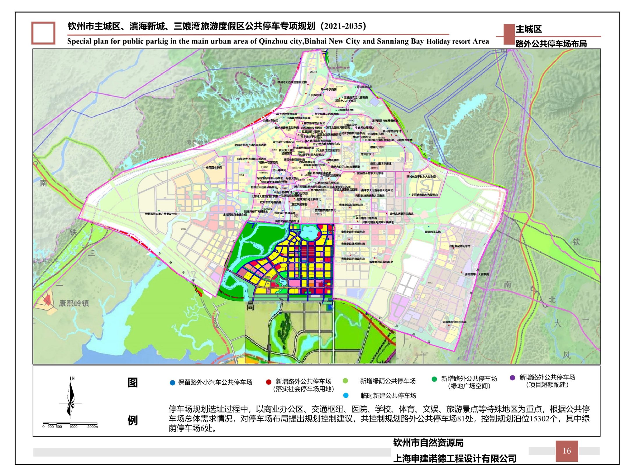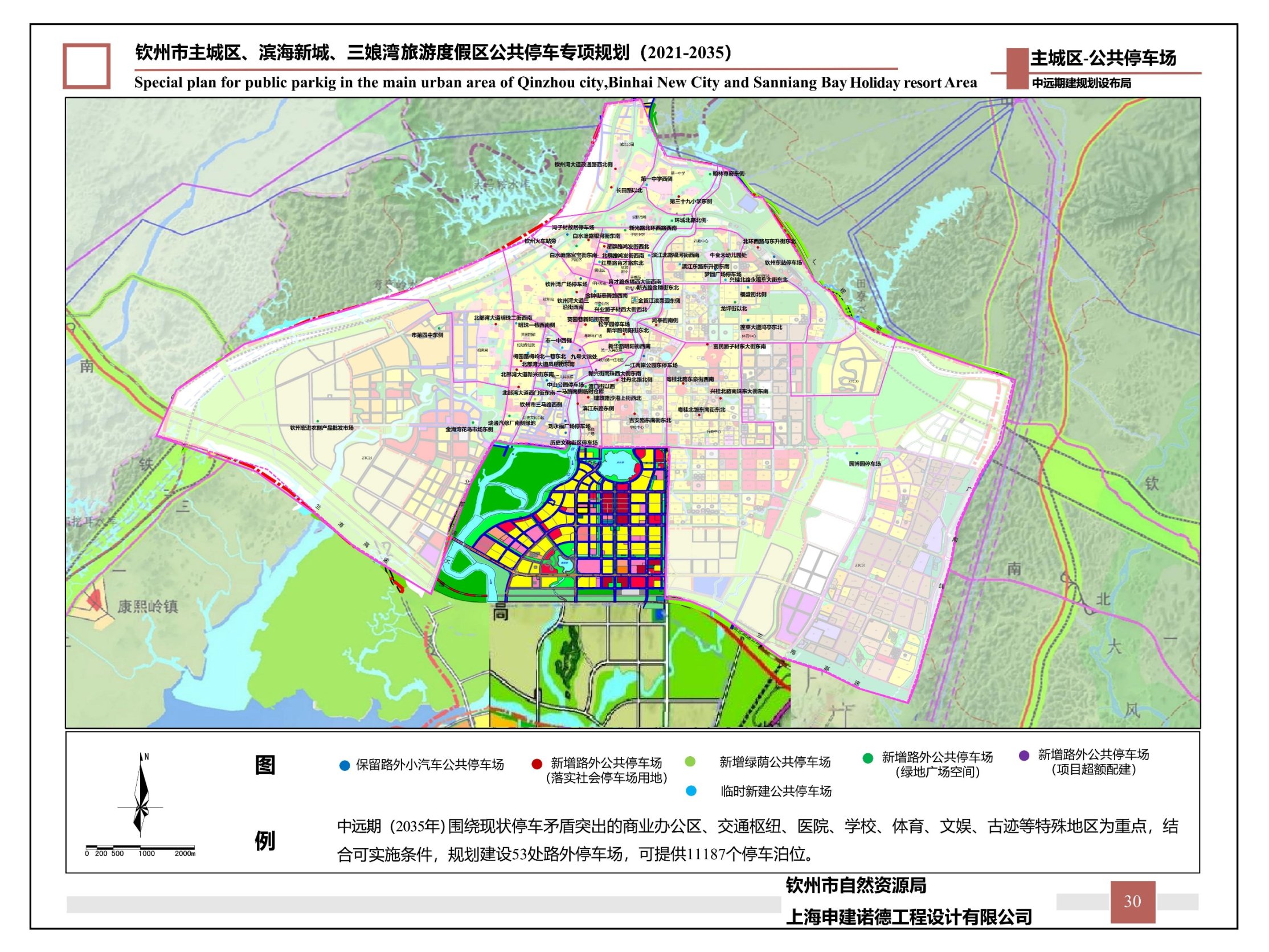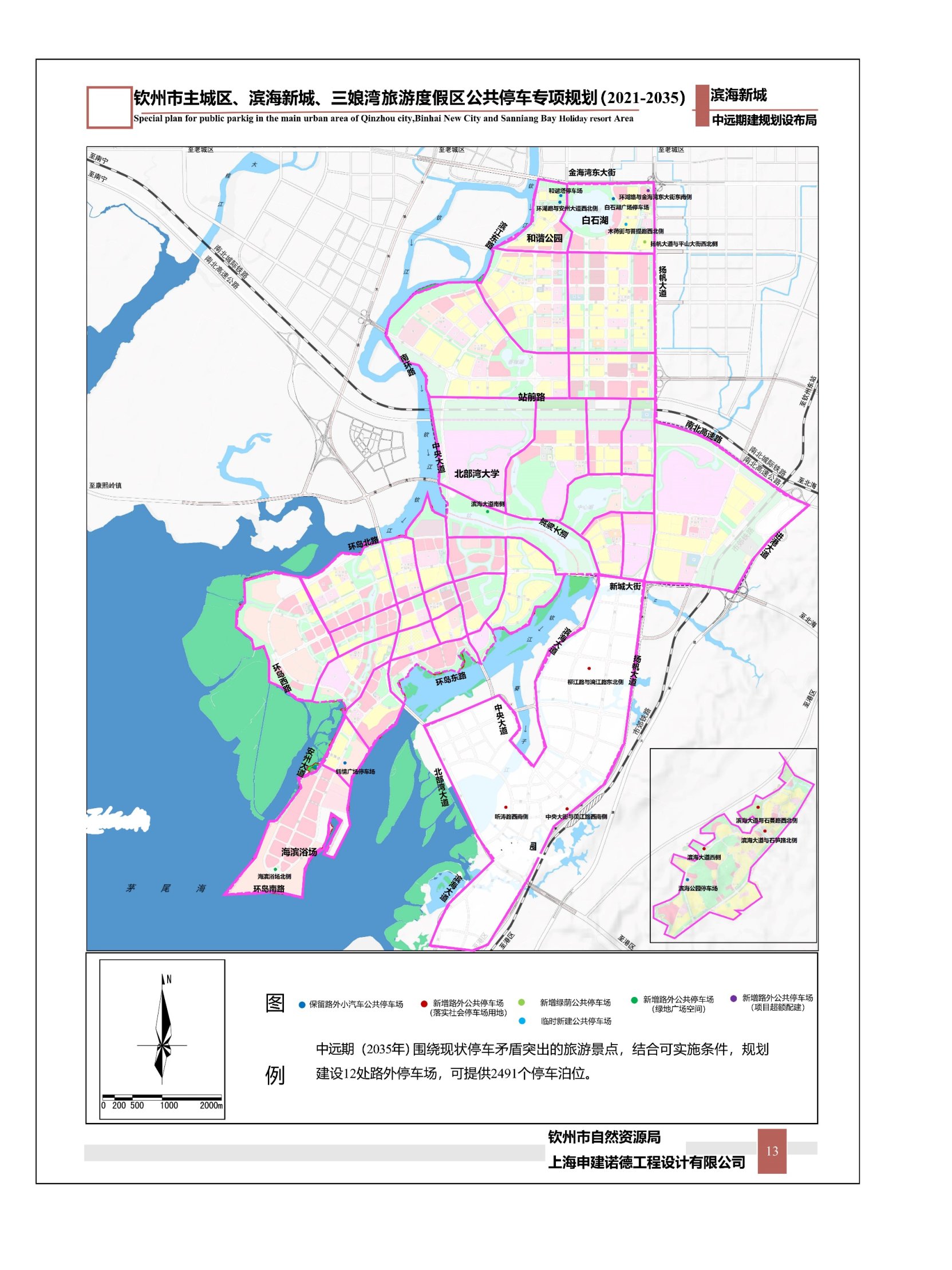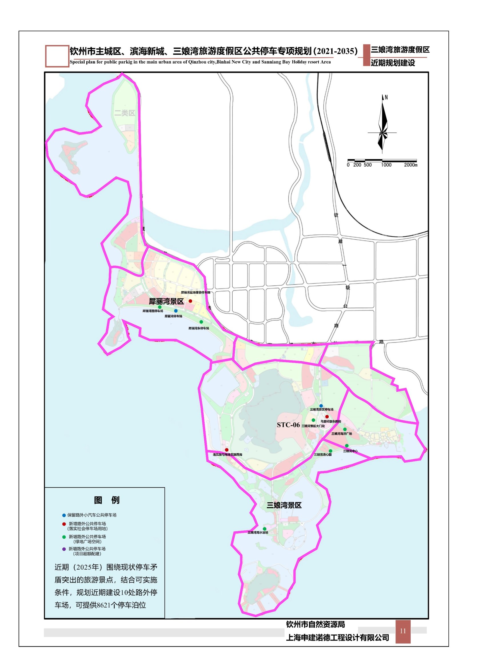 近期规划建设子材组团的鸿发停车场、石油公园停车场、白水塘停车场、火车西站前广场、钦州湾广场地下人防停车场,向阳组团的松宇公园停车场以及文峰、南珠组团的气象公园停车场,共计约1300个泊位。