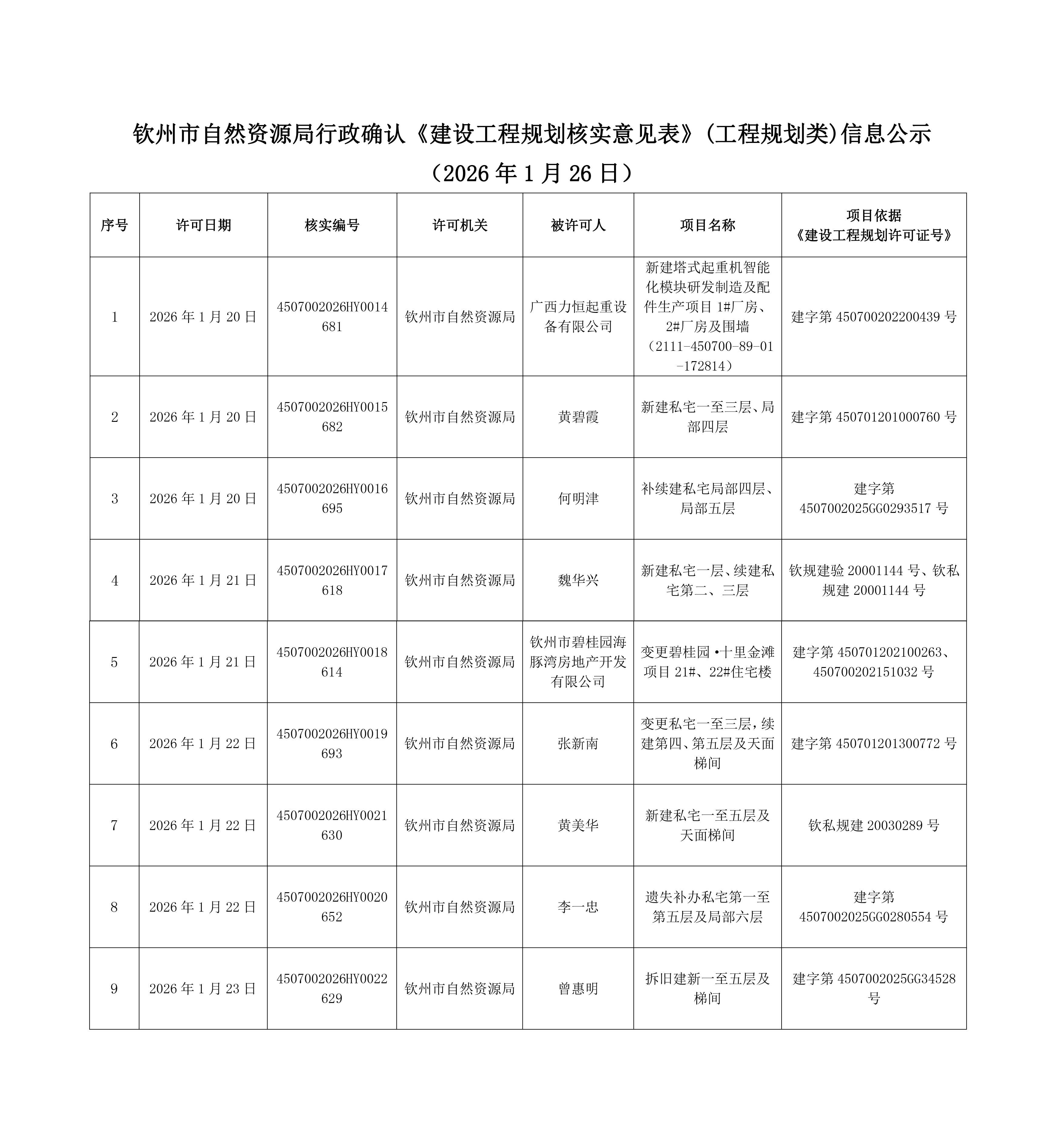 钦州市自然资源局行政确认《建设工程规划核实意见表》(工程规划类)信息公示(2026年1月26日)