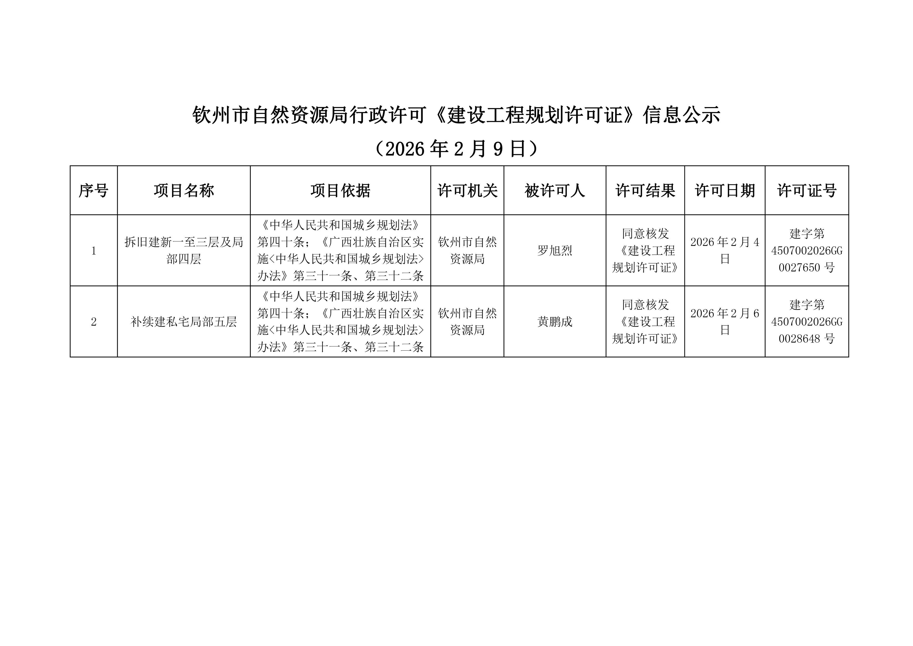 钦州市自然资源局行政许可《建设工程规划许可证》信息公示(2026年2月9日)