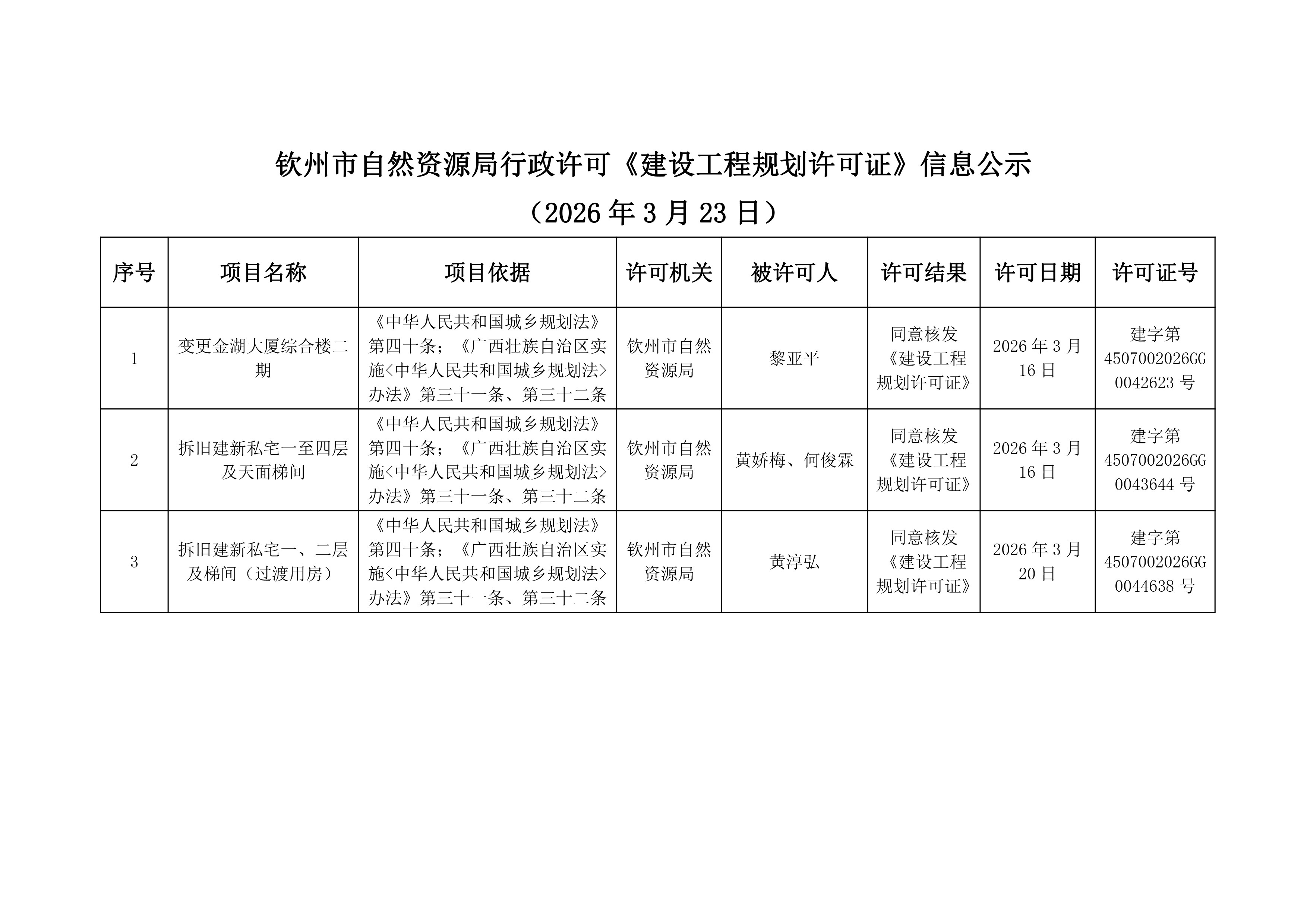 钦州市自然资源局行政许可《建设工程规划许可证》信息公示(2026年3月23日)