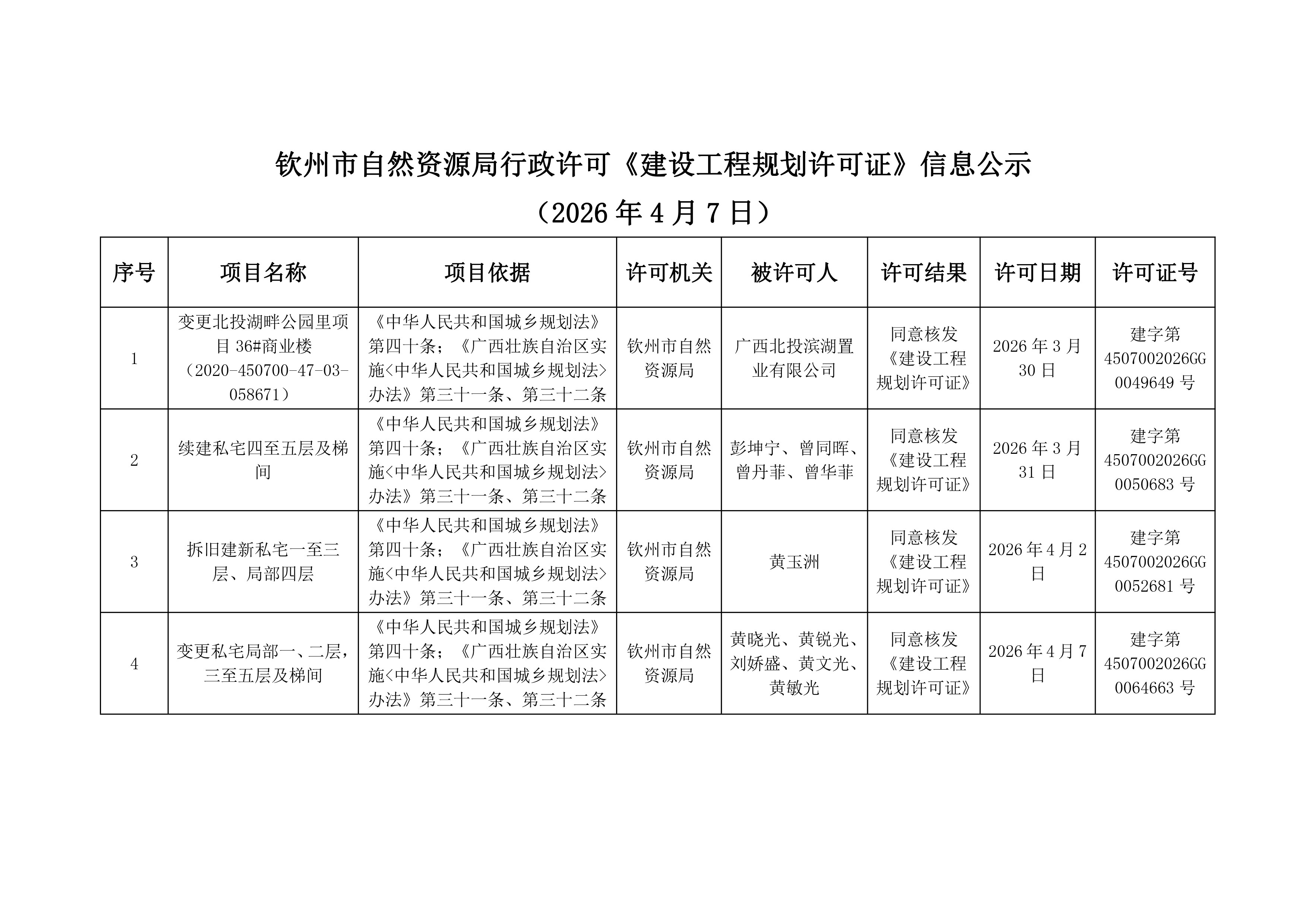 钦州市自然资源局行政许可《建设工程规划许可证》信息公示(2026年4月7日)