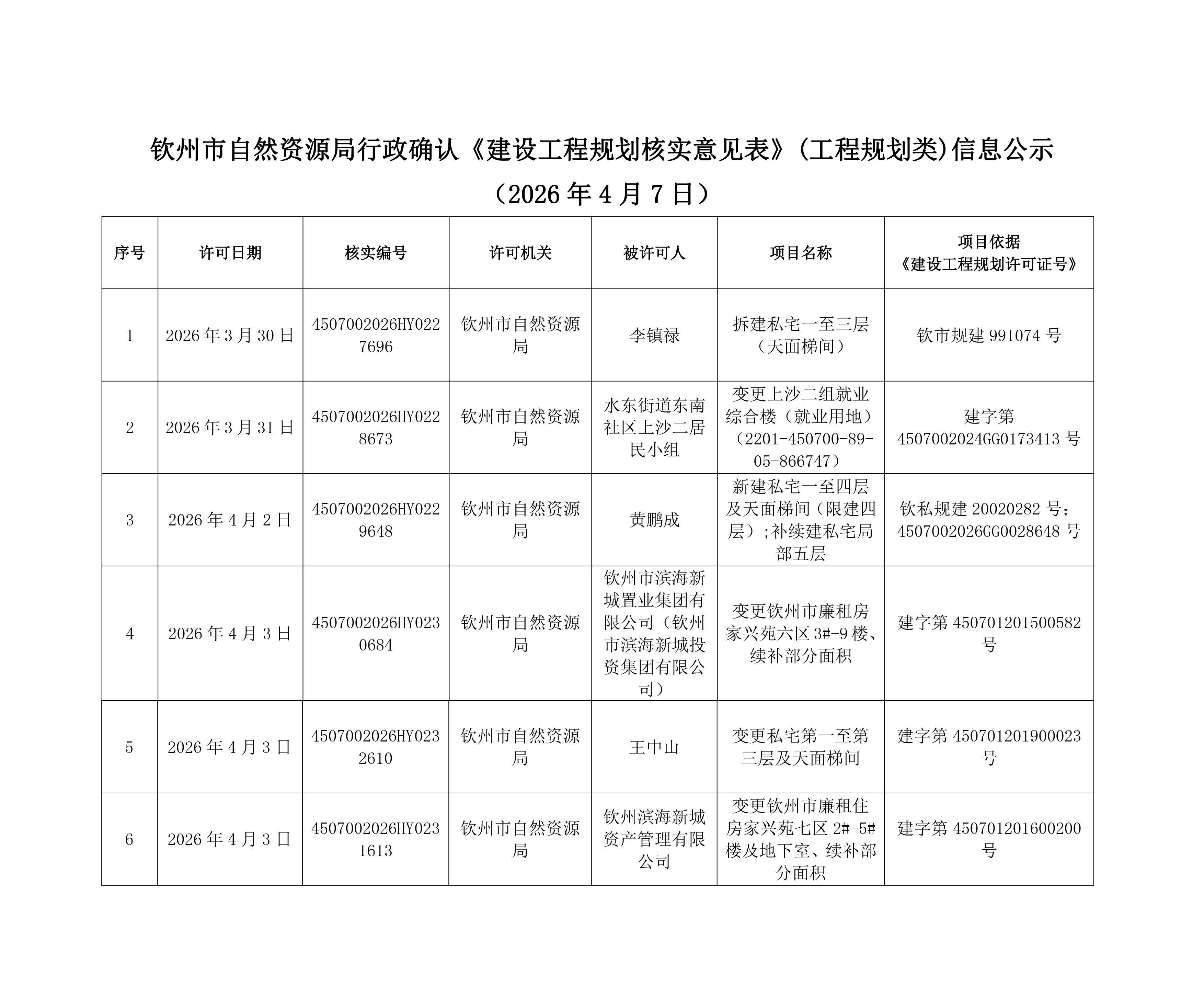 钦州市自然资源局行政确认《建设工程规划核实意见表》(工程规划类)信息公示(2026年4月7日)
