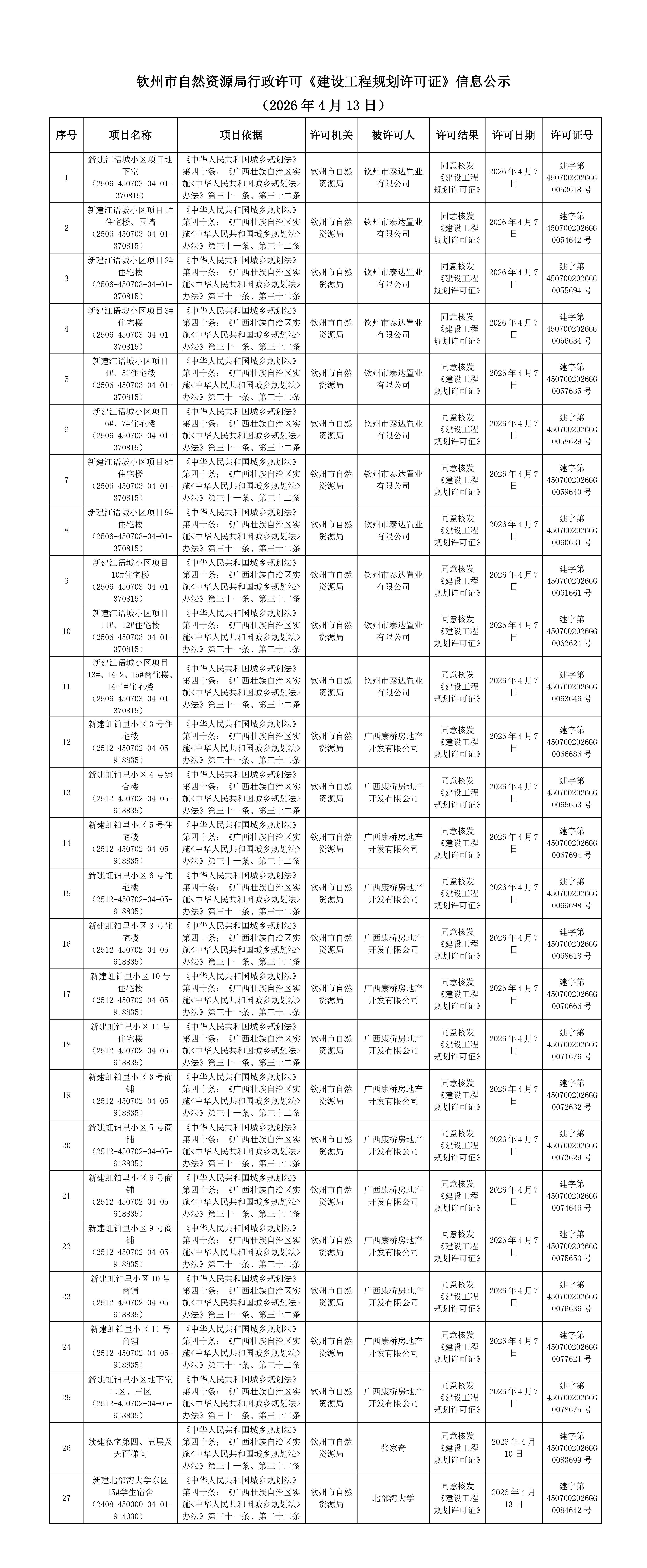钦州市自然资源局行政许可《建设工程规划许可证》信息公示(2026年4月13日)
