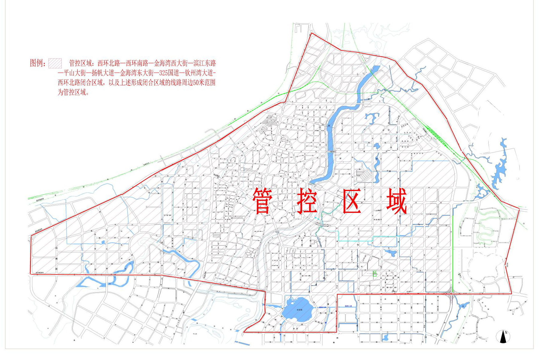 (一)管控区域。主城区西环北路-西环南路-金海湾西大街-滨江东路-平山大街-扬帆大道-金海湾东大街-325国道-钦州湾大道-西环北路闭合区域,以及上述形成闭合区域的线路周边50米范围为管控区域(详见附件)。