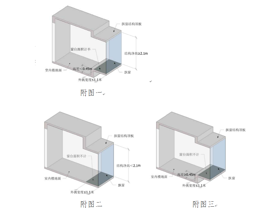 3.飘窗上下构件应外挑,飘窗进深应≤1.1米。窗台与室内楼地面高差在0.45米以下且结构净高在2.10米及以上的飘窗,应按其围护结构外围水平面积计算1/2面积(附图一);窗台与室内地面高差在0.45米以下且结构净高在2.10米以下的飘窗,或窗台与室内地面高差在0.45米以上的飘窗(附图二、附图三),不计算面积。