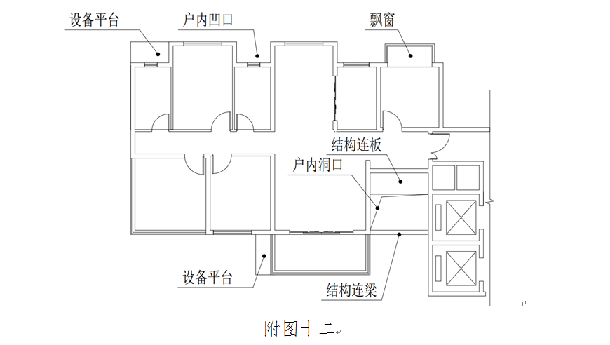 5.住宅户型的空间配置 指每套住宅户型中各功能空间的数量、位置关系、大小比例等。除了应遵守的相关住宅设计规范外,本规定中对于住宅居室以外的其它辅助功能空间及其构件进行了补充说明。飘窗、设备平台、结构连板、结构连梁、户内凹口、户内洞口的位置如下图所示(附图十二),其中:
