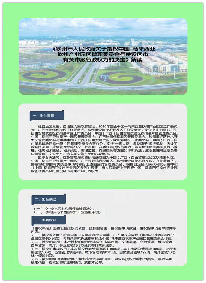 《钦州市人民政府关于授权中国–马来西亚钦州产业园区管理委员会行使设区市有关市级行政权力的决定》解读