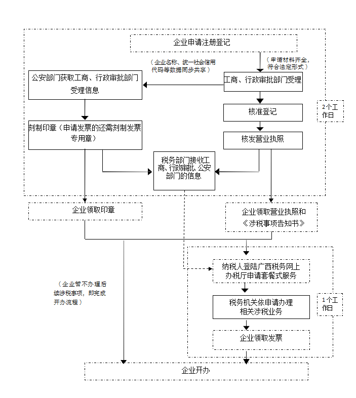 (三)税务部门收到工商部门推送的新设立企业登记信息和公安部门推送的印章刻制信息后,自受理新设立企业办税申请起1个工作日内按规定的发票票种核定标准办结。对于暂时无普通发票申领需求的企业,可以结合企业实际需要适时给予办理。