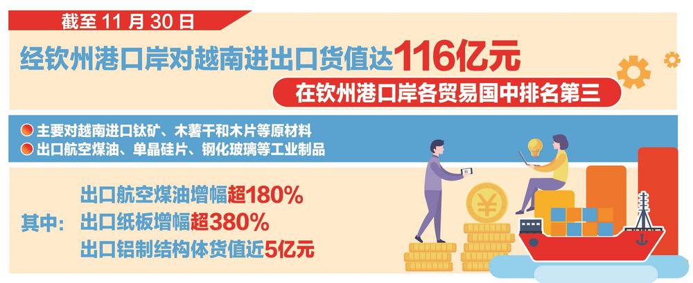 截至11月30日,经钦州港口岸对越南进出口货值达到116亿元,在钦州港口岸各贸易国中排名第三,主要对越南进口钛矿、木薯干和木片等原材料,出口航空煤油、单晶硅片、钢化玻璃等工业制品。其中出口航空煤油增幅超过180%、纸板增幅超380%,铝制结构体货值近5亿元,同比增长超过100%,经贸合作实现“双向奔赴”。