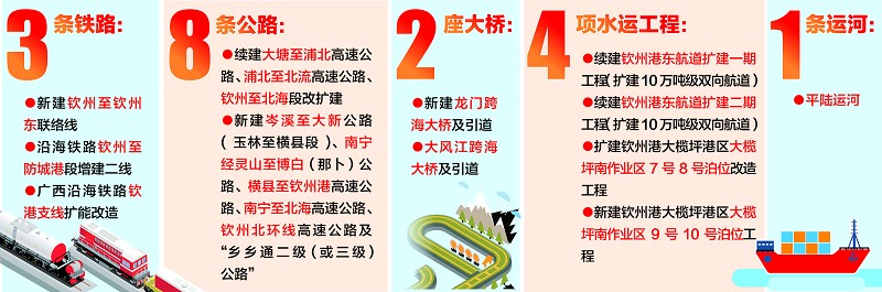 在铁路方面,新建钦州至钦州东联络线、沿海铁路钦州至防城港段增建二线、广西沿海铁路钦港支线扩能改造项目;公路方面,续建大塘至浦北高速公路、浦北至北流高速公路、广西钦州至北海段改扩建工程,新建龙门跨海大桥及引道、大风江跨海大桥及引道、岑溪至大新公路 (玉林至横县段)、南宁经灵山至博白(那卜)公路、横县至钦州港高速公路、南宁至北海高速公路、钦州北环线高速公路及“乡乡通二级(或三级)公路”;水运方面,续建钦州港东航道扩建一期工程(扩建10万吨级双向航道)、钦州港东航道扩建二期工程(扩建10万吨级双向航道),扩建钦州港大榄坪港区大榄坪南作业区7号8号泊位改造工程,新建钦州港大榄坪港区大榄坪南作业区9号10号泊位工程、平陆运河。