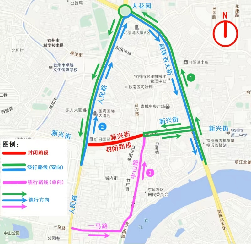 (二)钦州一桥往人民路方向(南珠西大街-大花园方向-人民路)。