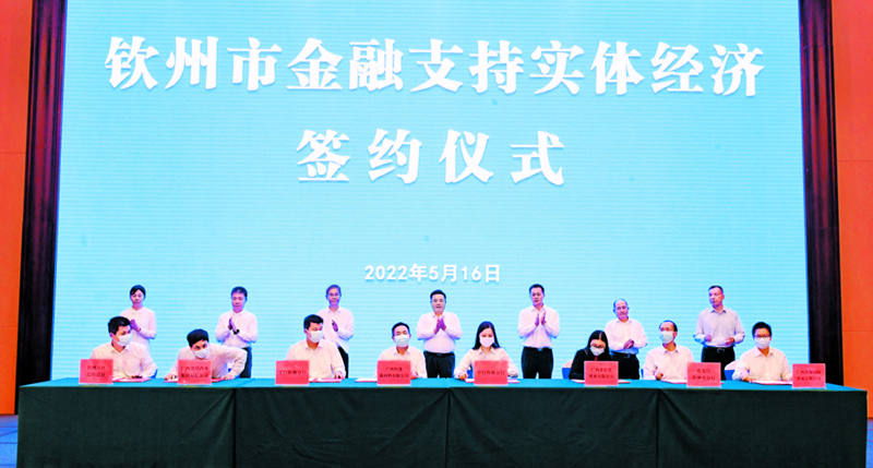 会上,相关部门和金融机构、企业代表作了发言。现场还举行了金融支持实体经济签约仪式,北部湾银行钦州分行与广西自贸区临海供应链有限公司、建设银行钦州分行与广西中伟新能源科技有限公司、农业银行钦州分行与广西华谊能源化工有限公司、桂林银行钦州分行与钦州锦峰海洋重工科技有限公司、钦州市区信用联社与广西邦琪药业集团有限公司、工商银行钦州分行与广西恒逸新材料有限公司、中国银行钦州分行与广西金桂浆纸业有限公司、农发行钦州分行与广西钦保国际贸易有限公司分别签约。